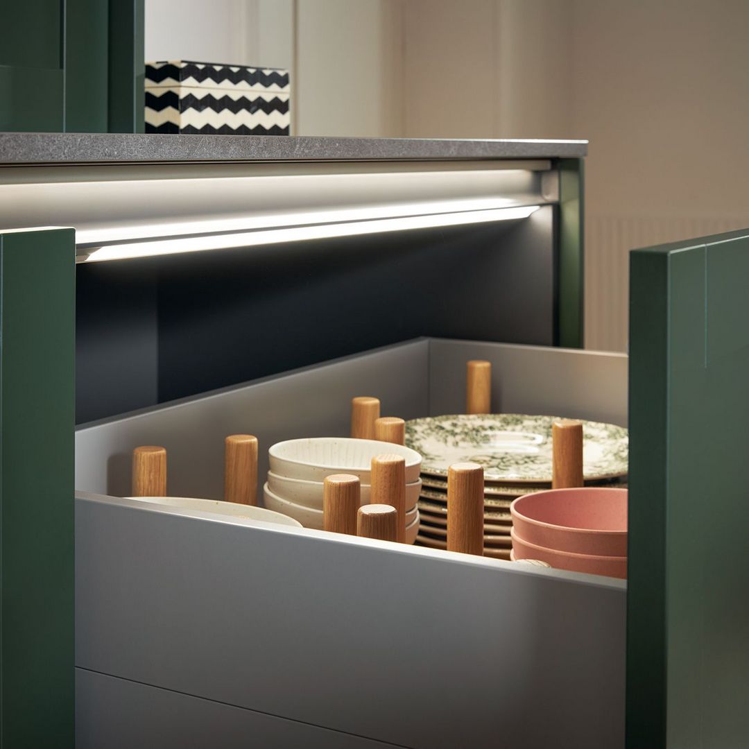 Discreet interior lighting can be integrated so drawers gently illuminate as they open and fade as they close. It’s not only beautifully ambient, but also incredibly practical - making it easy to find exactly what you need, even in low light.